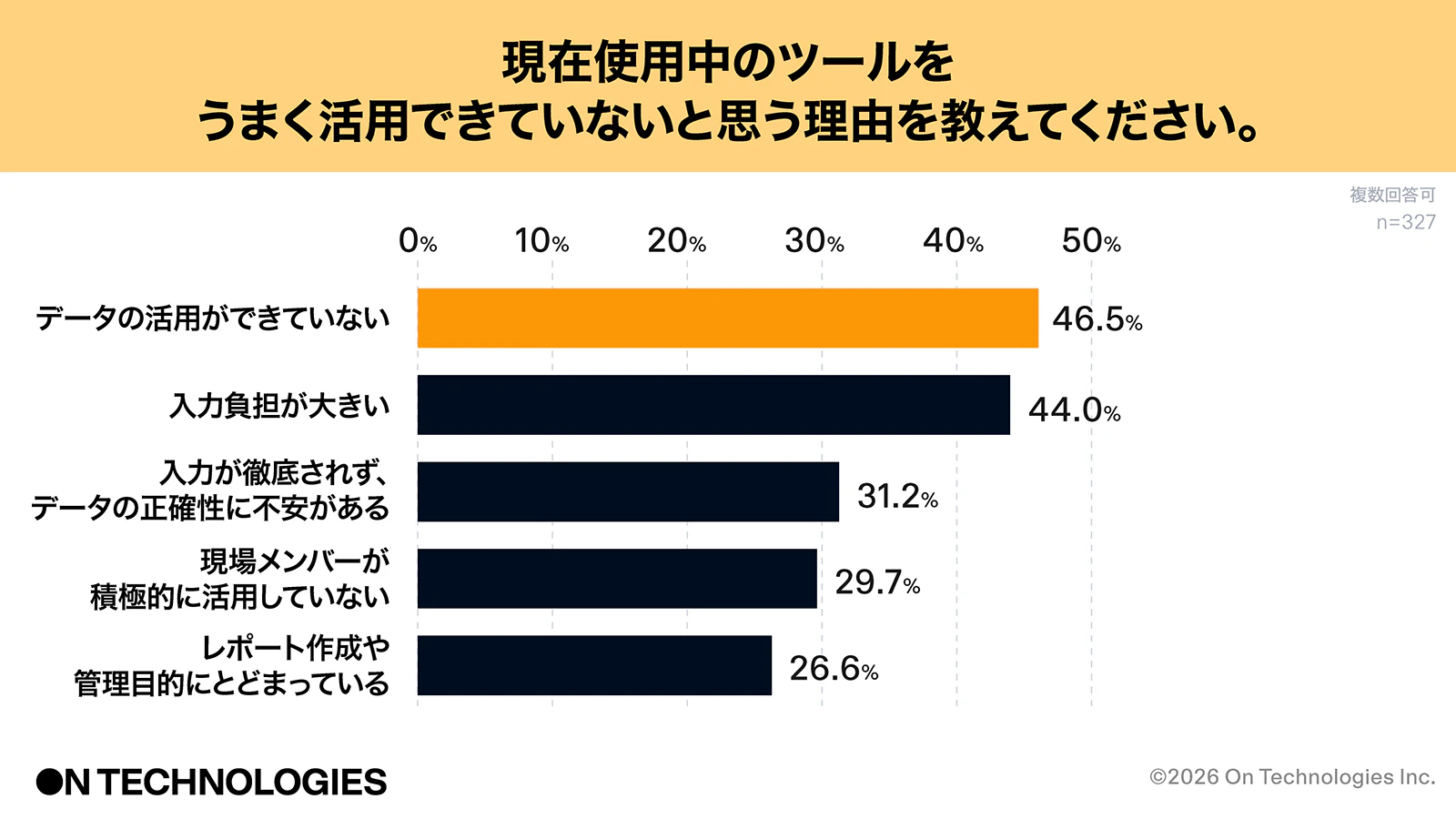 - 現在使用中のツールをうまく活用できていない理由は「データの活用ができていない」がトップ