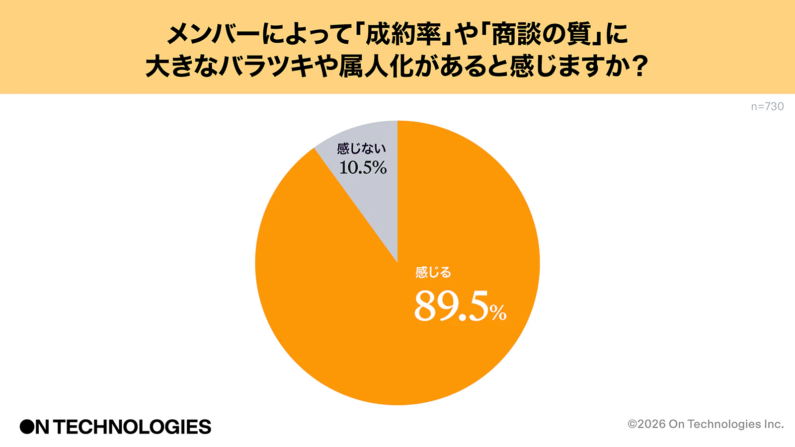 メンバー間での成約率や商談の質にバラツキ・属人化を「感じる」との回答は89.5%に達しました。原因は「営業の型の未標準化(52.8%)」や「ノウハウの言語化不足(47.8%)」であり、リソース不足から「部下育成の時間が不足(48.5%)」という悪循環に陥っています。